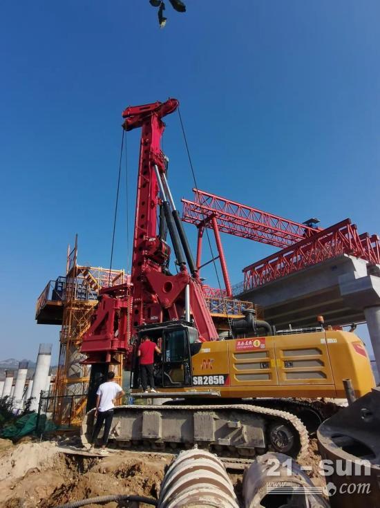 SR285M(低净空版)施工工地为山东济潍高速工程五合同段,该工程为高速桥梁桩,设计桩深44m,桩径1.8m,深度20m入岩,岩层为微风化灰岩,单轴抗压强度达到60mPa。SR285M(低净空版)可在大于13.6m的净空高度下施工,配置7×8m机锁杆,最大钻深达到52m,得益于SR285M强大的扭矩和加压力,该低净空钻机实现了轻松入岩并高效钻至设计桩深,其施工表现获得客户称赞。