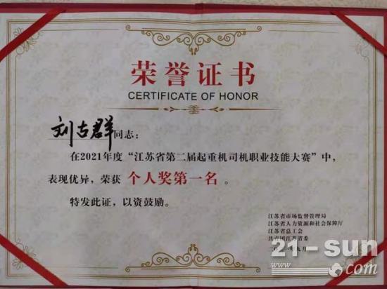 2021年9月26日~28日,由江苏省市场监管局、江苏省人力资源和社会保障厅、江苏省总工会、共青团江苏省委联合举办的“江苏省第二届起重机司机职业技能大赛”在南京隆重举行。经过激烈决逐,无锡代表队在13个队伍中脱颖而出取得佳绩,荣获团体第一名,来自江阴兴澄特种钢铁有限公司的刘古群荣获个人第一名。