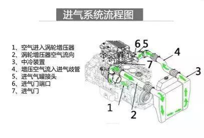 空气通过空气滤芯进入到发动机的第一关卡便是涡轮增压器,经压缩后的空气进入到中冷箱后,流经(部分发动机设有进气预热系统)进气管路后,压入进气歧管,最后由歧管压入汽缸中,与柴油混合燃烧。