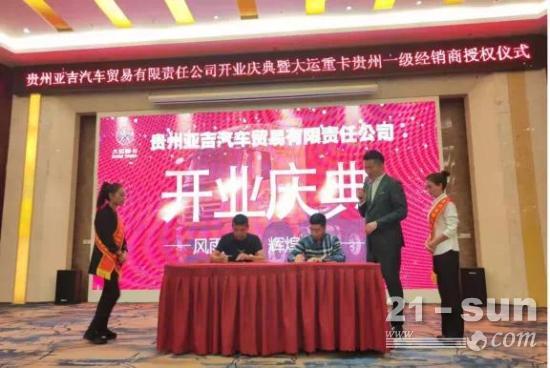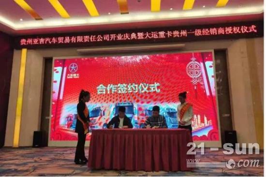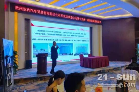 随后,西南营销中心总经理窦军峰发表了精彩致辞,窦总首先对各位贵宾的到来表示热烈的欢迎和诚挚的感谢,然后讲述了大运重卡的发展历程和取得的喜人成绩,展望了大运重卡的广阔前景。最后,对贵州亚吉汽贸的开业表示了衷心的祝贺,并同亚吉汽贸董事长吴总现场签订授权合同。