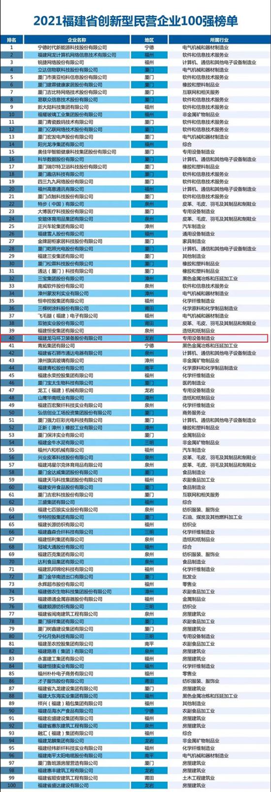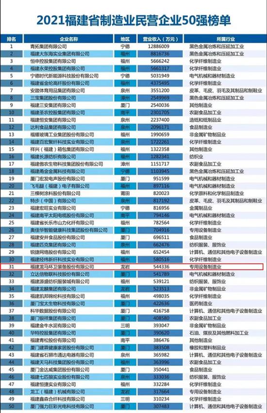 会上,省委统战部副部长、省工商联党组书记李家荣发布了2021福建省民营企业100强榜单,其中龙马环卫同时获得“2021福建省民营企业100强(排名第68位)”“2021福建省创新型民营企业100强(排名第40位)”“2021福建省民营企业制造业50强(排名第31位)”三项殊荣。上述荣誉的获得,体现了社会各界对龙马环卫综合实力、环卫装备制造实力和技术创新实力的充分肯定和高度认可。今后,龙马环卫将继续以习近平总书记“绿水青山就是金山银山”的生态文明理念为指引,进一步加大研发投入、提升工艺水平、拓展产业链条、聚焦主责主业,努力发展成为环境卫生整体解决方案领先者,积极为中国环境卫生事业高质量发展添砖加瓦。