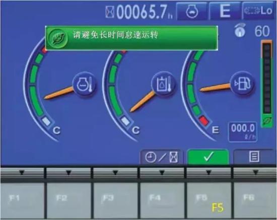 如果等待作业或短时间停止作业要超过5分钟,建议关闭发动机,以减少不必要的燃油消耗。当再次操作任何操纵杆或按下开关F5,怠速停止信息就会消失。