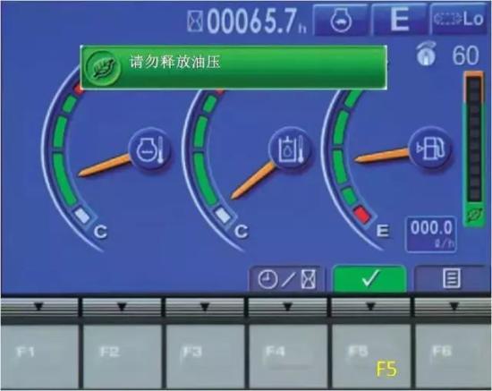在施工过程中,遇到非常坚硬挖也挖不动的工况,千万别使蛮力,不然不仅做的是无用功,还会造成液压油溢流。唉~憋坏了!溢流超过3秒钟,监控器上会显示液压溢流取消信息来提示您。经过10秒钟后或按下开关F5时,液压溢流取消信息消失。