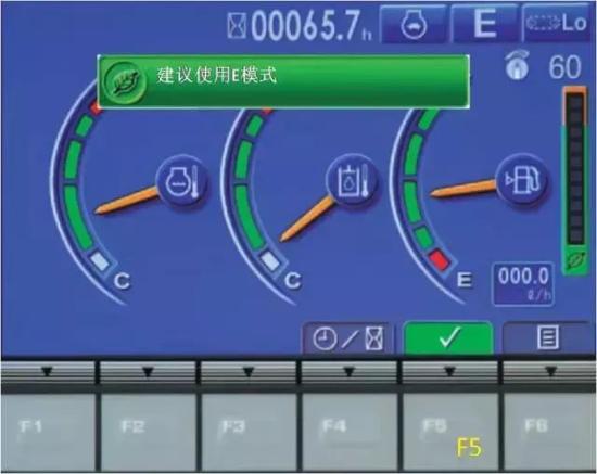 如果在P模式或ATT/P模式下轻载作业持续了10分钟以上,屏幕上会显示E模式建议信息。轻载作业时,把工作模式设为E模式吧,这样能减少不必要的燃油消耗。经过10秒钟后或按下开关F5时,E模式建议信息消失。