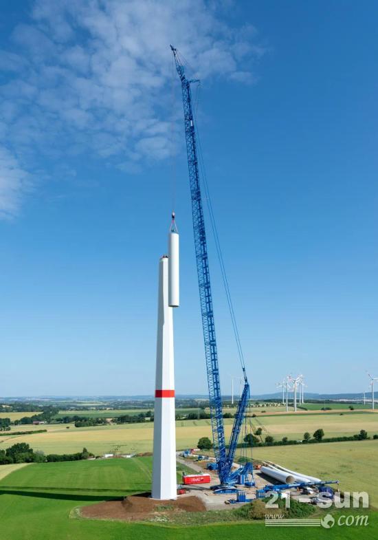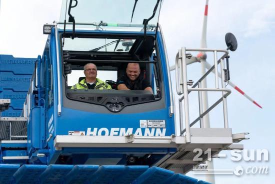 可不断调整的V-型架配重半径使得涂有蓝色油漆的Hofmann公司的起重机能够在帕德伯恩施工现场相对较小的空间内工作,甚至可以回转自如。为了安装风机部件,两名驾驶员随后将履带起重机转向靠近风机塔筒的位置——在半径26米将所有部件安装完成。即便是吊钩上承受最重的负载,即72吨的机舱和比其重3吨的传动系统,也没出现任何问题。
