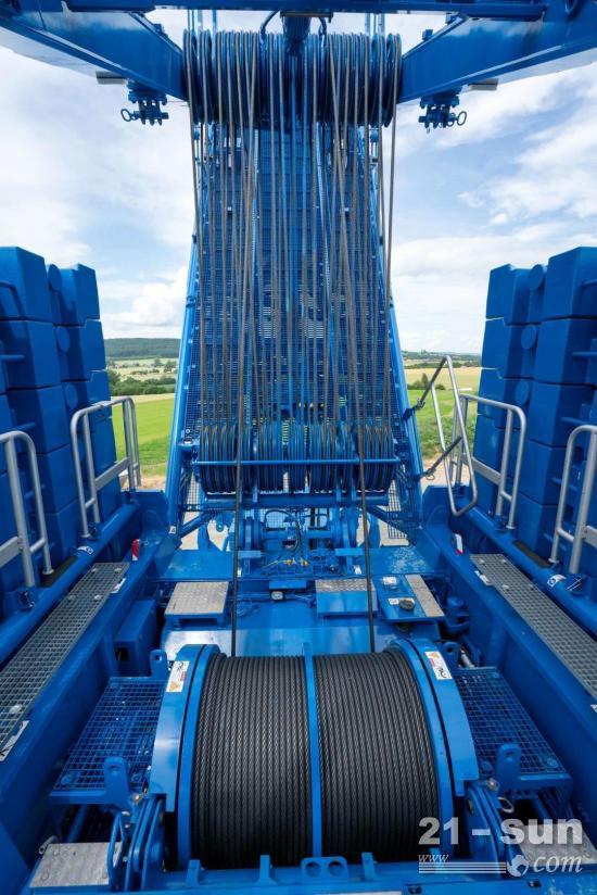 Christoph Bergmaier很高兴地说:“可变超起配重和V-型架允许我们在整个风机安装过程中带60吨的超起配重工作。所以我们不需要花费时间去处理配重的事情。”大量的配重只在扳起或放倒桁架臂时才用到。顺便说下,可以扳起的桁架臂达到198米这一惊人的长度。只需要4个销子,整个过程大约10分钟-总重375吨的配重就已经悬挂在超起臂上了。