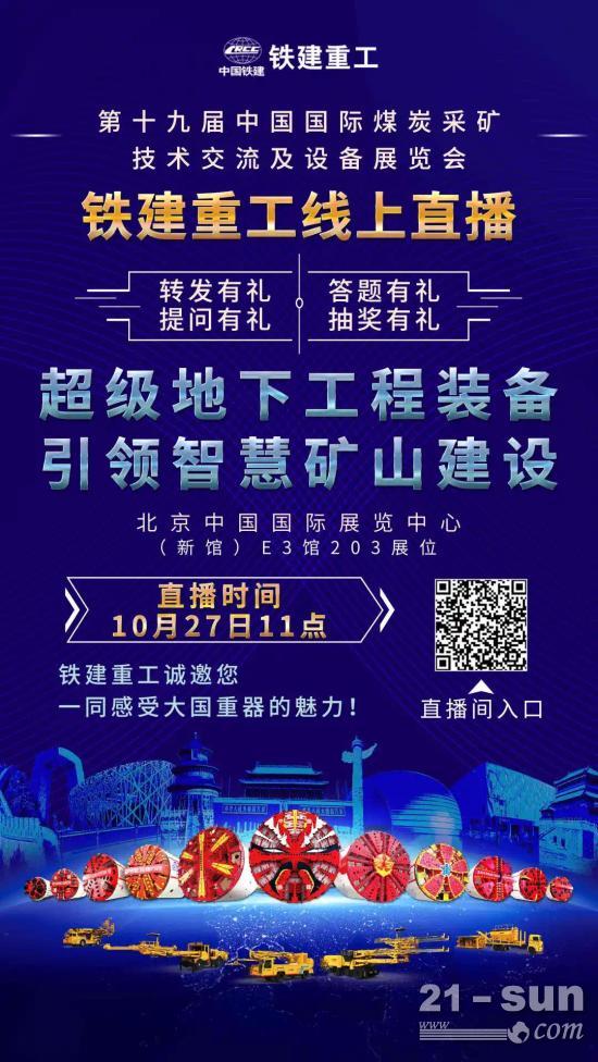 10月26日,第十九届中国国际煤炭采矿技术交流及设备展览会正式开展,10月27日11:00,铁建重工线上直播精彩开启,关注直播,您将品鉴:铁建重工超级地下工程装备整装集结,引领智慧矿山建设;参与互动,您将有机会获得产品模型、茶颜悦色周边产品、吉祥物公仔等精美礼品。