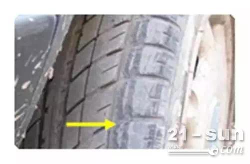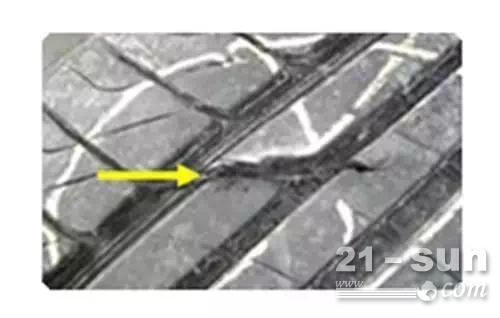 诊断七:轮胎连续性地被外物切割(例如:汽车挡泥板,汽车底盘的某些部件或外界障碍物等等);冬季使用防滑链也会造成胎面橡胶出现圆周向开裂的现象。