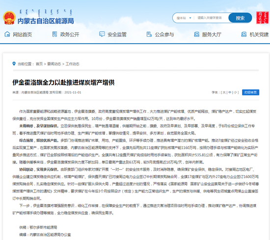 11月3日,作为国家重要能源和战略资源基地,伊金霍洛旗委、政府高度重视煤炭增产增供工作,大力推进煤矿产能核增、优质产能释放、煤矿稳产达产,切实扛起煤炭保供重任,充分发挥全国煤炭生产供应主力军作用。10月份,伊金霍洛旗煤炭产销量增至62万吨/天,达到年内最好水平。随着供暖季来临,伊金霍洛旗煤炭保供力度不断加码,单日最高产量达到63万吨,较9月底提高近10万吨/天,创年内新高。(内蒙古能源局)