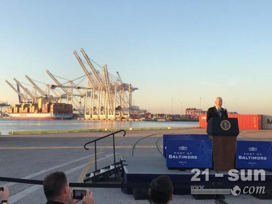 巴尔的摩港的官方推特进行了全程直播,并颇为骄傲地介绍了他演讲的背景:停有马士基(Maersk)货轮和最新巨型“新巴拿马式”起重机(Neo-Panamax cranes)的西格特(Seagirt)海运码头。
