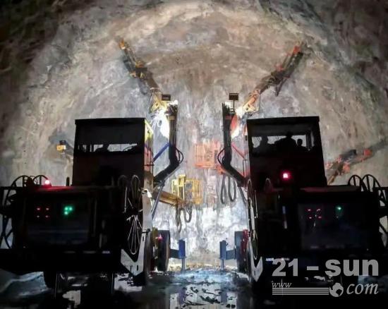 在安徽池州的岭上村隧道,中铁装备两台自主研制的DJ3C三臂凿岩台车正在紧张有序进行钻孔开挖作业,钻孔时间达2.5分钟/个,单循环开挖进尺平均在4.2-4.5米,实现隧道稳步高效开挖作业。服务人员积极作为,与项目部技术人员对接,优化炮眼布局工艺,提高爆破功效,最大限度利用施工窗口期检修设备,合理利用机械化优势,做到分秒必争,为工期履约提供有效保障。