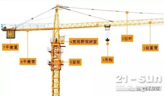 主要构件:主要有机座、标准节、回转上、下座、平衡臂、起重臂、塔尖等,由于钢结构长期日晒雨淋,又受力较大,容易出现锈蚀、变形、裂纹、弯曲以及松脱等现象,要仔细观察,逐项检查。零部件:重点检查构件连接板、螺栓、销轴磨损以及润滑等情况,特别是螺栓,维护时必须按力矩要求拧紧。
