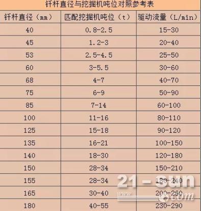 常见的破碎锤钎杆直径有53、68、75、85、100、120、135、140、150、165、175、185、190(单位均为毫米)等等,不同品牌之间也细分了很多型号,下面我们就来看看这些型号的破碎锤应该与多大的挖掘机匹配。