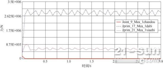 1)最大应力节点出现在破碎锤支承架上,最大应力值在0 时刻出现;2)各个柔性体构件的最大应力值并不是出现在同一时刻;3)大臂和破碎锤支承架受力较大,小臂受力适中,连杆的应力值很小,说明此工况下,大臂、破碎锤支承架以及小臂为主要的承载构件;4)0 时刻之后,破碎锤支承架上节点应力迅速减小,大臂上节点应力由较大值迅速减小到一较稳定值后呈正弦波动变化, 小臂上节点应力由较小值迅速增大到一较稳定值后呈正弦波动变化,大臂、小臂、支承架明显受到载荷冲击;5)三条曲线0 时刻载荷的骤变反映出,破碎锤破岩初始阶段臂架系统受到载荷的冲击作用较明显,经过较短时间后节点应力均趋于稳定,应力值大小适中,呈正弦变化波动,臂架系统整体受载良好。通过对臂架系统液压缸组的约束铰点进行破岩作业全程力的监测,得到液压缸组的受力曲线,如图8。可以发现:1)初始时刻大臂液压缸和小臂液压缸受到载荷波动变化非常明显, 载荷波动很大, 液压缸组结构明显受到初始载荷的冲击, 铲斗液压缸受力相对较大、小臂液压缸组很小;2)液压缸组的受力经过短时间的冲击之后,都趋于稳定,呈正弦趋势变化。