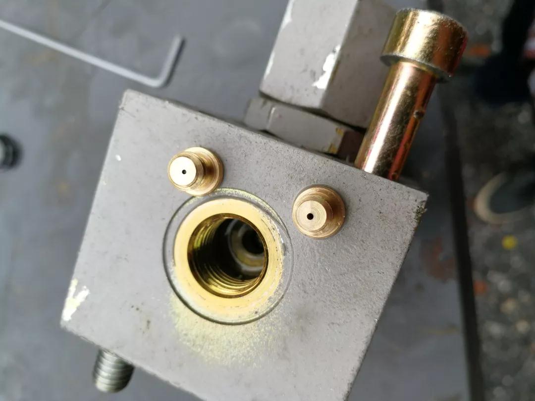 将平衡阀端盖螺杆的锁紧螺母松开,用内六角扳手将螺杆往里再拧紧一圈,以保证X口油路可以更轻松推开平衡阀阀芯。但是试车时故障依旧,用压力表测量卷扬下降口压力约5MPa,按照设计这个压力是完全可以打开平衡阀了。怀疑X口阻尼是否堵塞,拆下X口0.9的阻尼,发现阻尼畅通,再拆下对侧堵头内的0.7的阻尼,也未发现阻塞,如图所示。