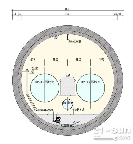 该工程采用一台开挖直径9.15米的泥水平衡盾构机由江心洲向江南工作井掘进。线路全长755.6米,其中盾构隧道长度693米,采用双层衬砌结构,隧道管片外径8.8米,隧道内纵向并排布设2根直径2.2米的球墨铸铁污水压力管道,单管标准长度6米,单根重约10.5吨,国内罕见。