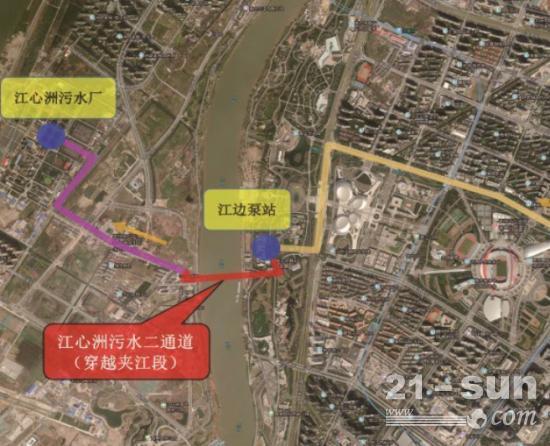 江心洲污水二通道工程起于江心洲市民广场西侧地块,下穿江心洲市民广场、江堤路后,于旗杆渡口南侧进入夹江水域,在棉花堤北侧进入陆域,最后穿越江堤路进入滨江公园,终于江南工作井与现状污水通道连通,项目建设完成可将主城内约每天40万立方米的污水直接输送至江心洲污水处理厂。