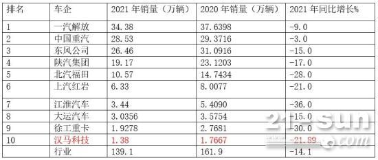 表:2021年主流重卡车TOP10累计销量及同比(据公开数据)