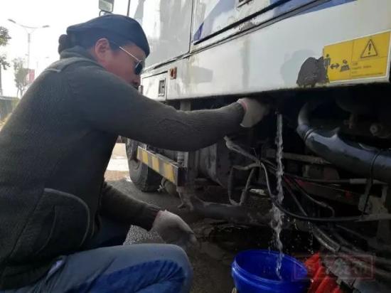 清扫车每天作业前需加水,上车系好安全带,叶军驾驶车辆向北面的光明路驶去。在补水点,补水、刷车……每一项都是每天工作中必须进行的步骤,整个过程中,他都做的一丝不苟。