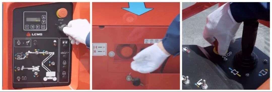 2、升降工作平台停放好后,必须关闭上下控急停开关、电源总开关,钥匙开关切换至中间位置并拔下钥匙。