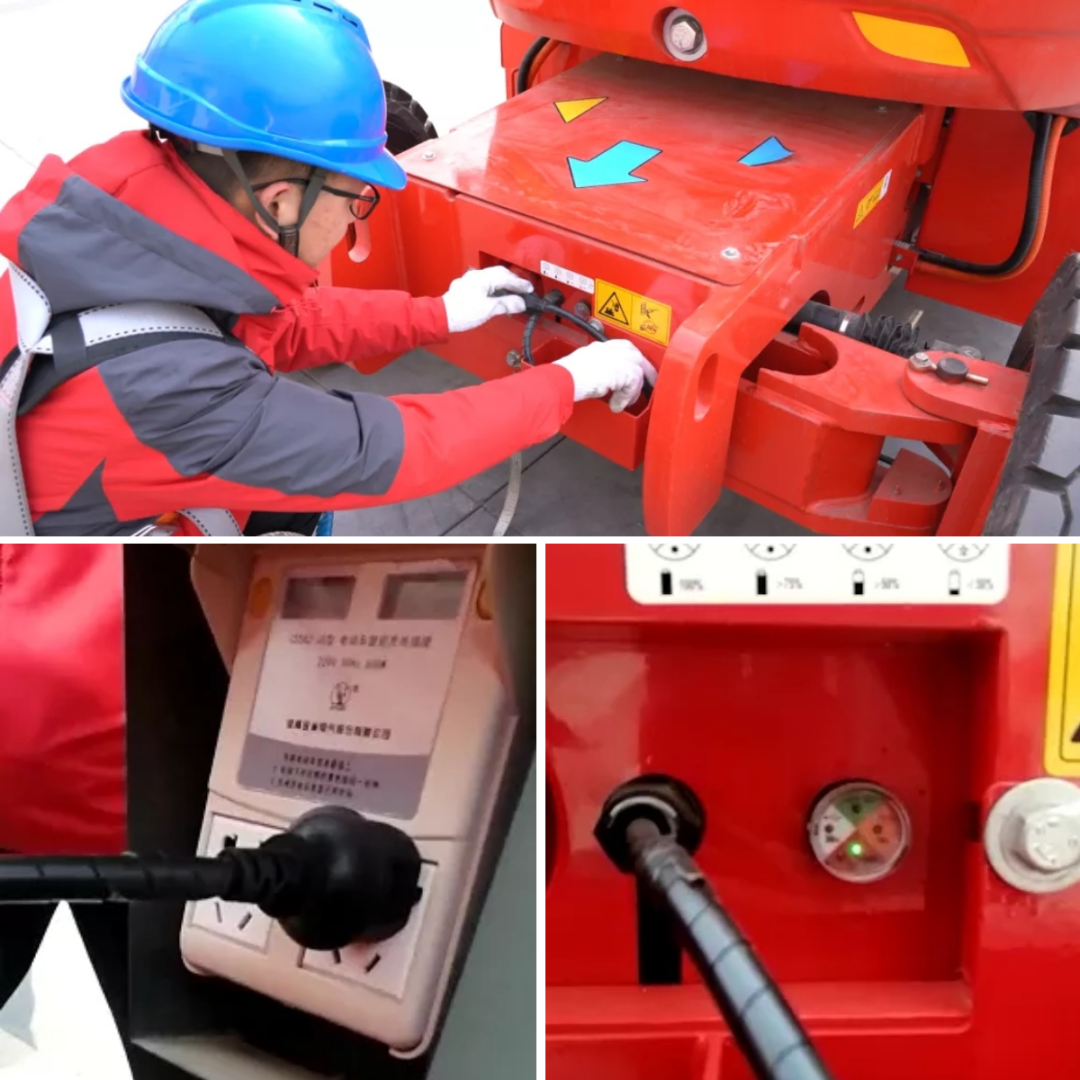 3、对于蓄电池动力升降工作平台,根据剩余电量多少,来确定是否需要充电。如需充电,请进行充电作业:插入充电插头后,确认充电器或充电指示灯显示充电状态正常后方可离开;充电完毕请把充电线放置在设备指定位置。