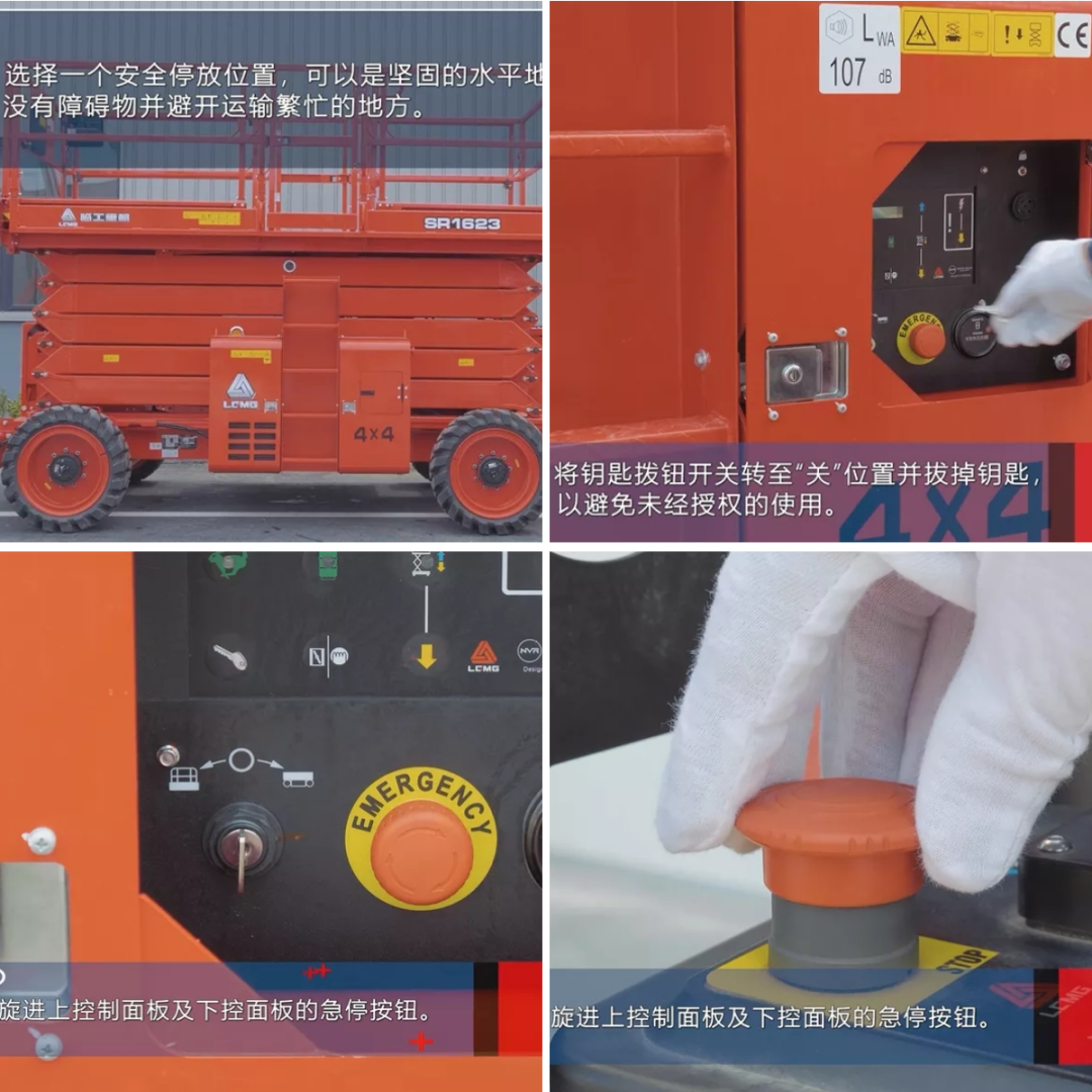 ②升降工作平台停放好后,必须关闭上下控急停开关、电源总开关,钥匙开关切换至中间位置并拔下钥匙。