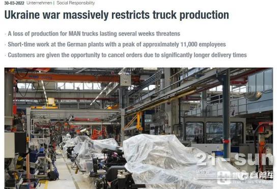 比如说,我们今天的主角——德国著名的卡客车制造企业——曼恩商用车,最近在官网上发布了一则新闻:由于乌克兰战争的影响,曼恩商用车的卡车生产线受到了十分严重的威胁。持续数周的战争使曼恩的供应链情况恶化严重,独木难支。目前,曼恩旗下的卡车生产线已经停止生产新卡车。曼恩位于德国慕尼黑和波兰克拉科夫的工厂已经于3月14日停产。而其纽伦堡、萨尔茨吉特和维特利希工厂的生产也受到了重大的影响。