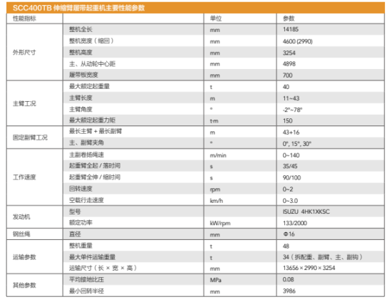 SCC400TB伸缩臂履带吊最大额定起重量:40t;最大主臂长度:43m;最大起重力矩:150t·m