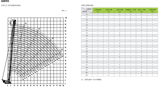 采用盾构工况,21+9m:190t@10m,满足10m直径及以下盾构机吊装钢筋笼吊装,72米主臂:122t@10m,满足60m及以下高度钢筋笼吊装桥板梁吊装,36+24m:107t@14m,满足100t以下预制桥板梁吊装;