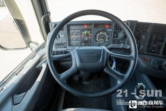 前面罩可分为上下两级,分别向上和向下打开,下层的前面罩可当作踏板使用,帮助清洁挡风玻璃。打开前面罩,可以发现车辆的线束捆扎十分整齐,驾驶室采用气囊悬挂,没有受损。同时,前面罩上的警告贴和提示贴都完好无损,看着赏心悦目。