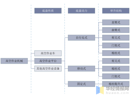 一般根据高空作业机械底盘的性质,可将其分为高空作业平台和高空作业车两大类。根据底盘动力,又可以将其分为自行走式高空平台(配备内燃机或电动机,具有行驶能力)、移动式高空平台(外力推动)和固定式高空作业平台。除了底盘的差异以外,高空作业机械之间的另一个重要区别是举升机械结构的形式。高空作业车的举升机械均采用直臂式或曲臂式结构。而高空作业平台采用的举升机械结构则更加多样,常见的有直臂式、曲臂式、剪叉式、桅柱式、门架式和桅柱爬升式。