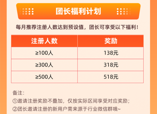 除开机惠宝常规福利外,团长可额外享受邀请注册奖励,月月都有奖,百元红包轻松拿!每月推荐注册人数达到预设值,即可享受以下福利: