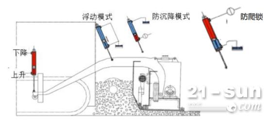 当摊铺机停机待料再起步时,熨平板前部的沥青料温度下降,沥青的承托力变大,若此时还是浮动模式,则熨平板会往上“爬坡”,导致“起包”,所以此时就需要打开防爬锁功能。
