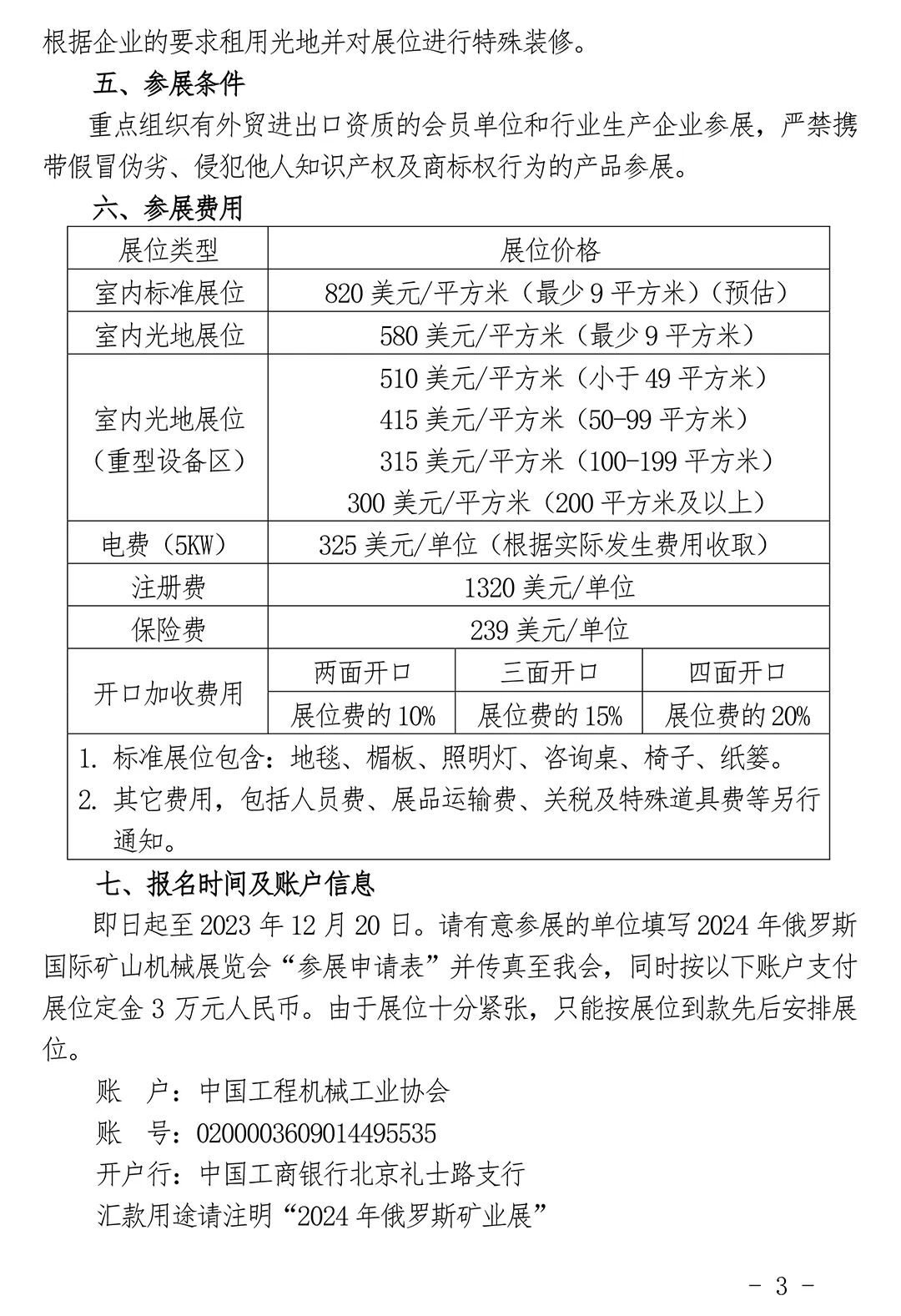 即日起至2023年12月20日。请有意参展的单位填写2024年俄罗斯国际矿山机械展览会“参展申请表”并传真至我会,同时按以下账户支付展位定金3万元人民币。由于展位十分紧张,只能按展位到款先后安排展位。
