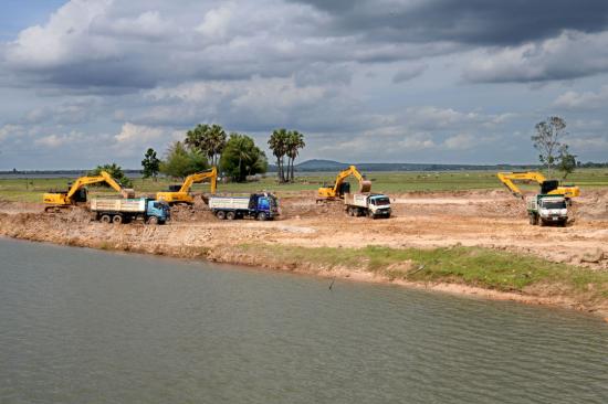 在泰国武里南府某市政储水池扩建项目工地上,6台柳工920E挖掘机正在进行挖土作业。