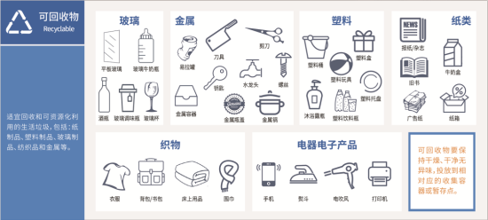 可回收物:是适宜回收、可循环利用的生活废弃物,可回收物的种类虽然不少,但也有方便记忆的口诀:“纸塑玻金衣”。