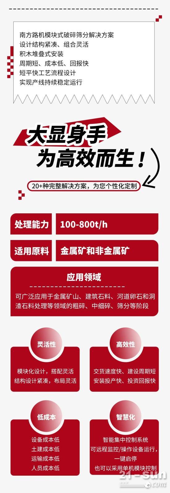 南方路机模块式破碎筛分解决方案,设计结构紧凑、组合灵活,积木堆叠式安装。周期短、成本低、回报快,短平快工艺流程设计,实现产线持续稳定运行。
