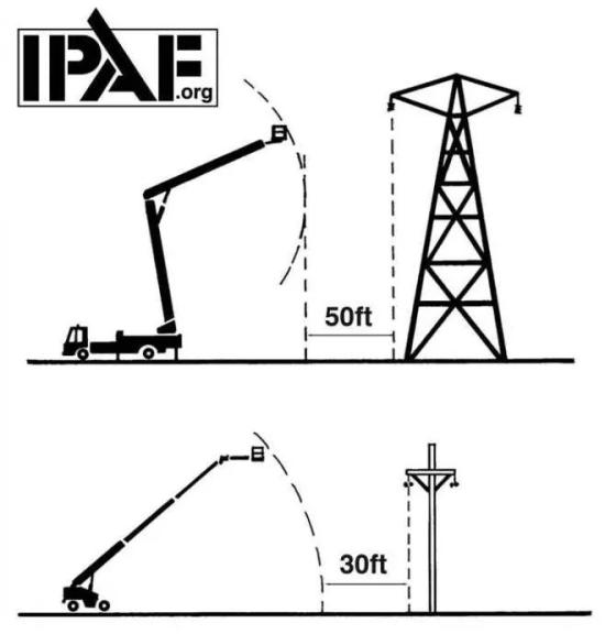 要知道,在没有直接接触电力线的情况下也可能发生触电,因为如果移动升降工作平台(MEWP)离配电线路距离不足9米(30英尺),离输电线路距离不足15米(50英尺),则可能导致电弧或闪弧,这个距离是高空作业平台完全伸出去以后(最大作业半径)的距离,即15米(50英尺)和9米(30英尺)。