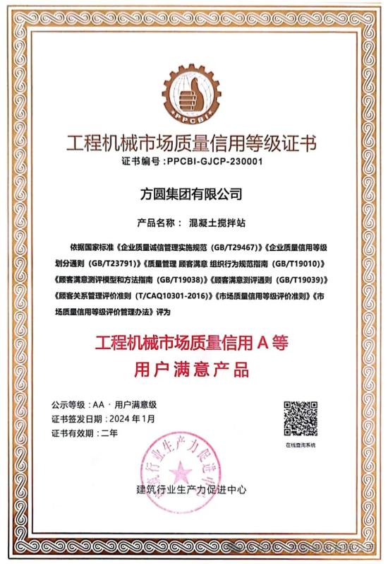 近日,方圆集团混凝土搅拌站产品再获由建筑行业生产力促进中心颁发的“工程机械市场质量信用A等用户满意产品”证书。