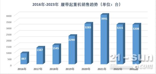 我国履带式起重机近年来销量呈现不断增长态势,但进入2022年,市场销量亦出现大幅下滑。数据显示,2021年我国履带式起重机销量为3991台,同比增长21.6%。2022年履带起重机3215台,同比下降19.4%。2023年数据显示,与上年销售情况相当,略有下降。