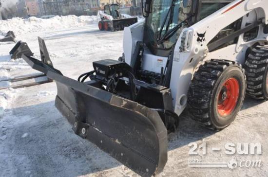 山猫滑移装载机与吹雪机的组合,是城市道路、小区和市政设施清雪的又一利器。通过前面的导管最远可将雪抛至10米以外的非道路区,特别适合清理大范围道路积雪。
