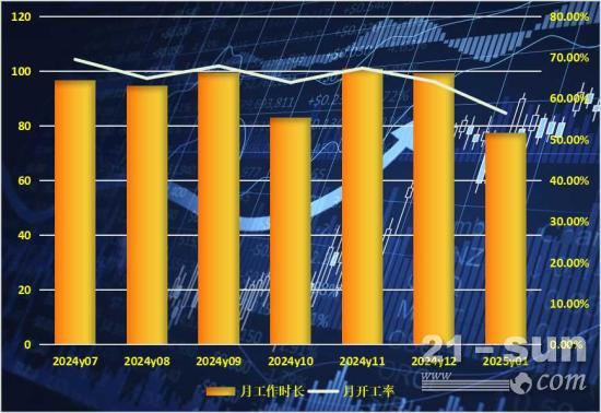 从市场形势看,1月份,全国多省市集中开工重大工程项目,工程机械设备整体开工率为56.20%,同比增长1.43个百分点,平均工作时长74.6小时,同比增长3.61%。其中,装载机开工率56.4%,平均工作时长77.5小时。