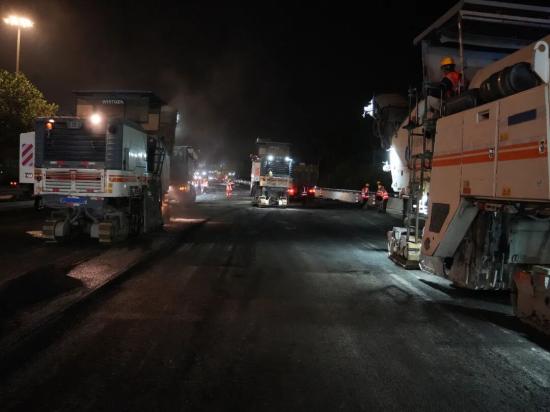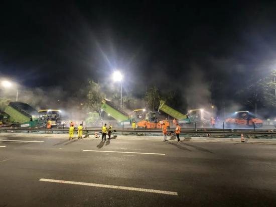 对道路段,严格实施“当日铣刨、当日摊铺”,大幅缩短单点作业时长。同时,采取针对性的措施,道路和桥梁均采用“全幅铣刨、全幅摊铺”工艺,最大限度保障施工期间白天开放交通时道路通行的舒适性与安全性。