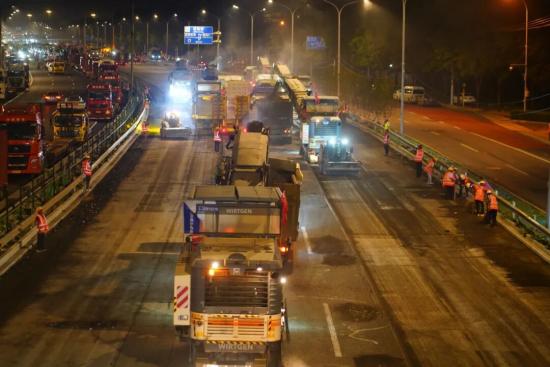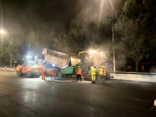 为了最大限度的减少施工对于交通带来的影响,施工方对面层沥青摊铺采取创新模式:每天开辟 10 余处作业面同时施工,施工窗口期仅凌晨 5 个小时。