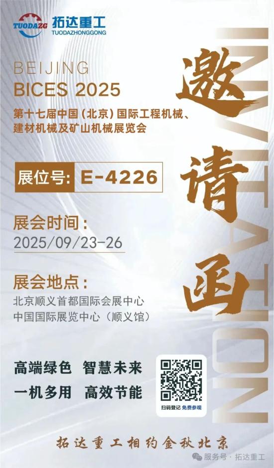 2025年9月23—26日,第十七届中国(北京)国际工程机械、建材机械及矿山机械展览会(BICES 2025)将于中国国际展览中心顺义馆隆重开幕。拓达重工将携多款创新产品与技术解决方案盛大亮相,诚邀您共赴行业盛宴,见证科技与制造的深度融合。