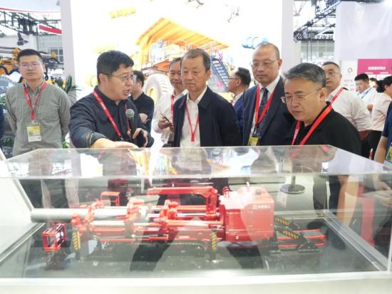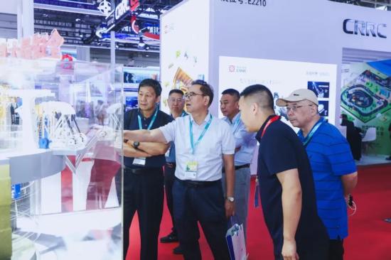 中国国家铁路集团有限公司副总工程师王晓州(中)一行莅临铁建重工展台,铁建重工技术总监姬海东(左二)讲解