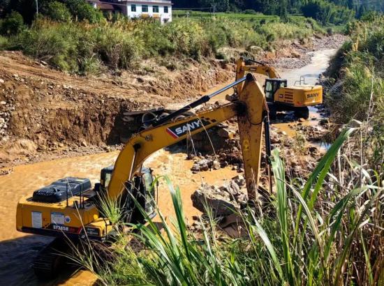 湖南资兴救援现场:三一挖机正在进行河道清淤