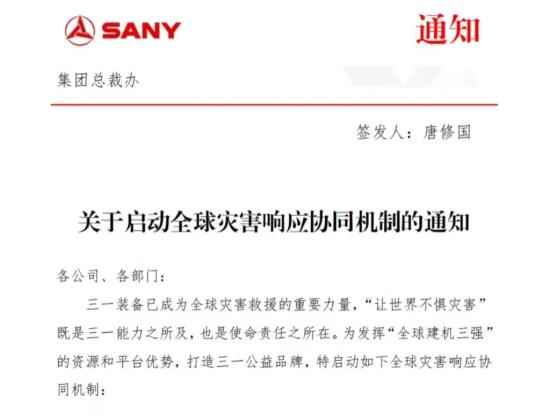 2025年,三一集团与三一基金会正式启动“全球灾害响应协同机制”。让救援行动从“单点响应”走向“系统建构”,从“国内主力”迈向“国际协同”。