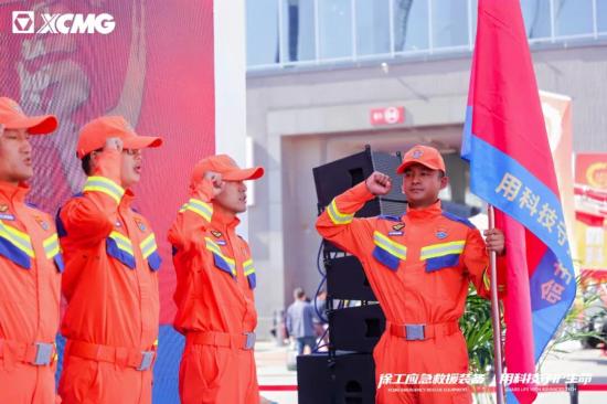 徐工消防总经理、党委书记袁少震将一面象征使命与担当的队旗郑重授予徐工应急救援队。全体队员肃立宣誓:“对党忠诚,纪律严明;赴汤蹈火,竭诚为民……”铮铮誓言,拳拳初心,这支徐工队伍“时刻准备、冲锋在前”。