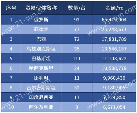 从数量上看,对13个国家出口轮挖超百台,排在首位的是591台的菲律宾,之后为577台的乌兹别克斯坦、508台的俄罗斯、472台的越南以及407台的吉尔吉斯斯坦。
